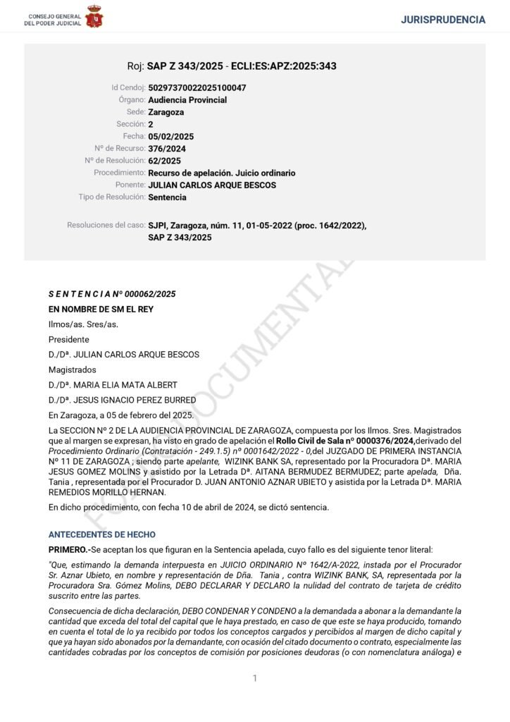 Tras demandar a la entidad financiera Wizink Bank, conseguimos que tanto el Juzgado de Primera Instancia como la Audiencia Provincial de Zaragoza confirmaran la nulidad del contrato por usura y cláusulas abusivas.